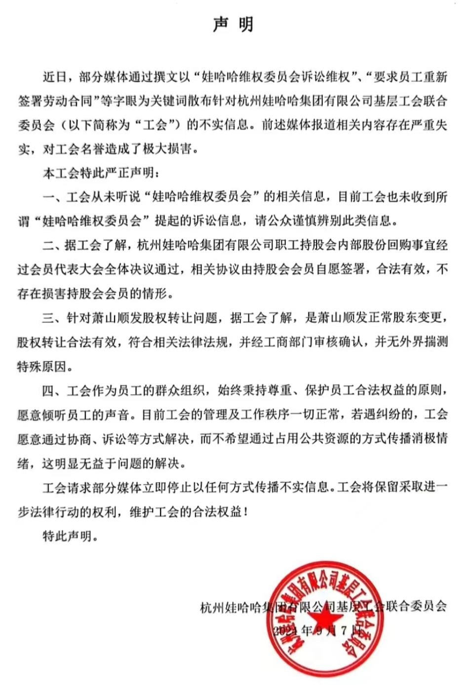 声明表示,据工会了解,杭州娃哈哈集团有限公司职工持股会内部股份回购事宜经过会员代表大会全体决议通过,相关协议由持股会会员自愿签署,合法有效,不存在损害持股会会员的情形。