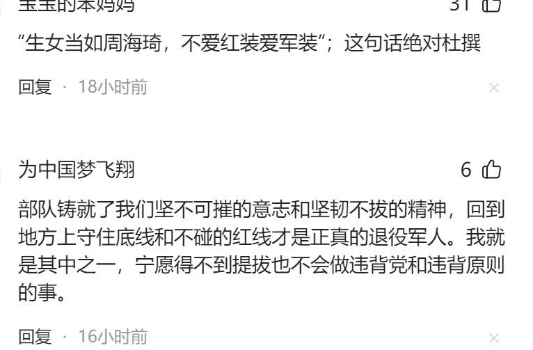 “部队铸就了我们坚不可摧的意志和坚韧不拔的精神,回到地方上守住底线和不碰的红线才是正真的退役军人。我就是其中之一,宁愿得不到提拔也不会做违背D和违背原则的事。”