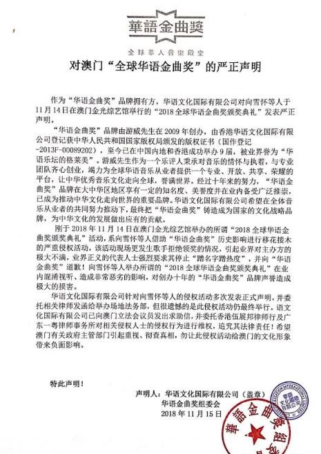 今天(11月15日),“华语金曲奖”官方微博发表了一则声明:“华语金曲奖”品牌由游威先生在2009年创办,由华语文化国际有限公司登记获中华人民共和国国家版权局颁发的版权证书(国作登记-2013F-00089202)。内部人士也强调:“版权、品牌使用权都在我们这里,澳门的这个(全球华语金曲奖)我们跟进了几个月了,它就是一个侵权的东西。”