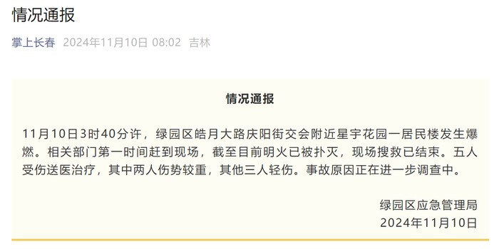 长春市绿园区应急局10日发布通告称,11月10日3时40分许,绿园区皓月大路庆阳街交会附近星宇花园一居民楼发生爆燃。相关部门第一时间赶到现场,截至目前明火已被扑灭,现场搜救已结束。五人受伤送医治疗,其中两人伤势较重,其他三人轻伤。事故原因正在进一步调查中。