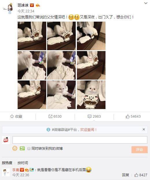 范冰冰深夜晒李晨与爱猫互动:这就是父女情深