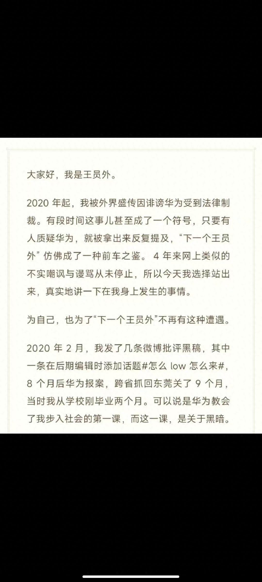 因为 黑华为 被 #跨省 抓捕的博主“ 王员外 ”近日在微博发帖讲述了他的故事。