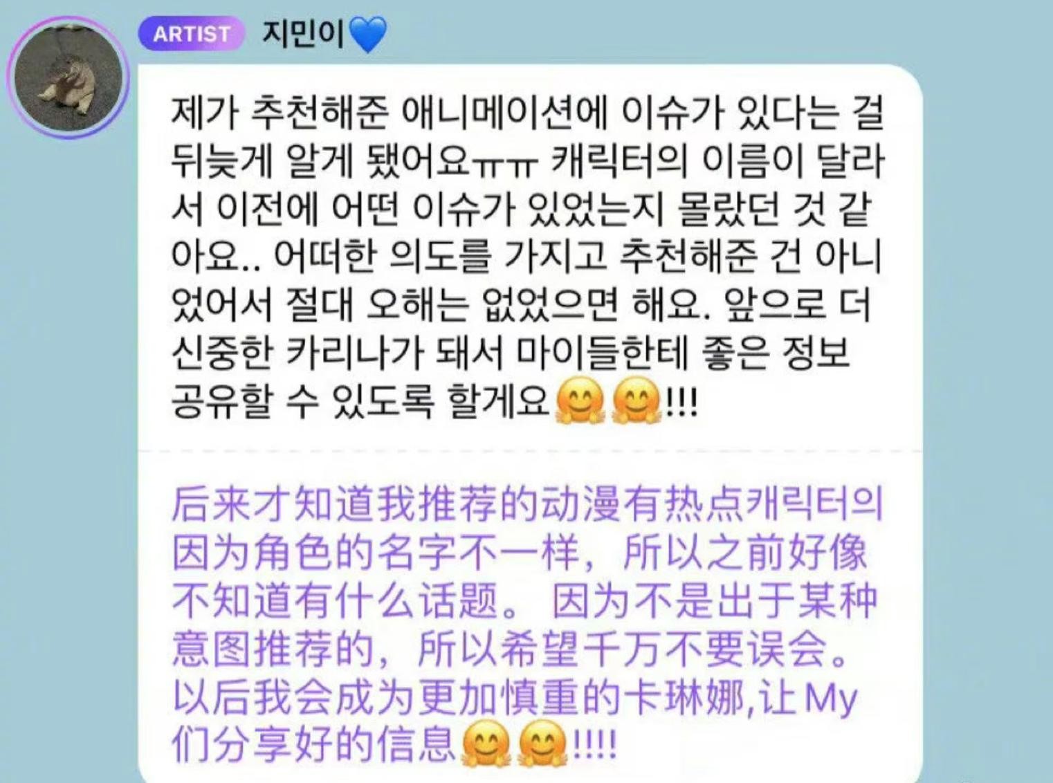 柳智敏发文表示:“我后来才知道之前推荐的动漫存在争议,因为角色名字有改动,所以我并不知道以前存在的问题。我没有带任何意图去推荐这部动漫,希望大家不要误会。以后我会成为更加谨慎慎重的KARINA,努力为各位MY们分享积极正向的内容。”