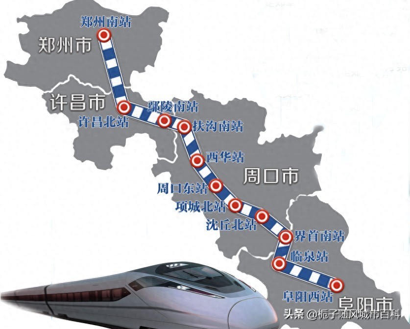 截至2019年12月,郑阜高速铁路由郑州南站至阜阳西站,全长276千米,沿线共设11座车站,设计速度为350千米/小时,列车最高运营速度为310千米/小时。