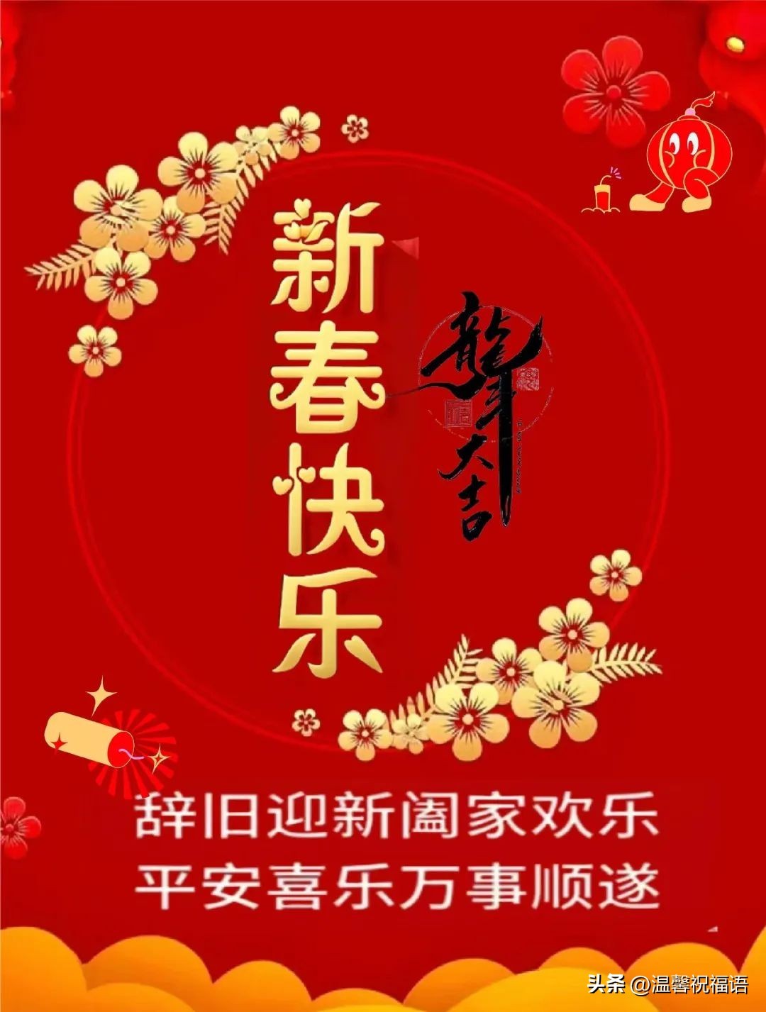 新禧已到,向你问好。祝你:笑口常开,快乐每分每秒;开心播报,时时喜上眉梢;如愿之年,事事如意顺好;万千祝福,礼到意到福到!春节快乐!