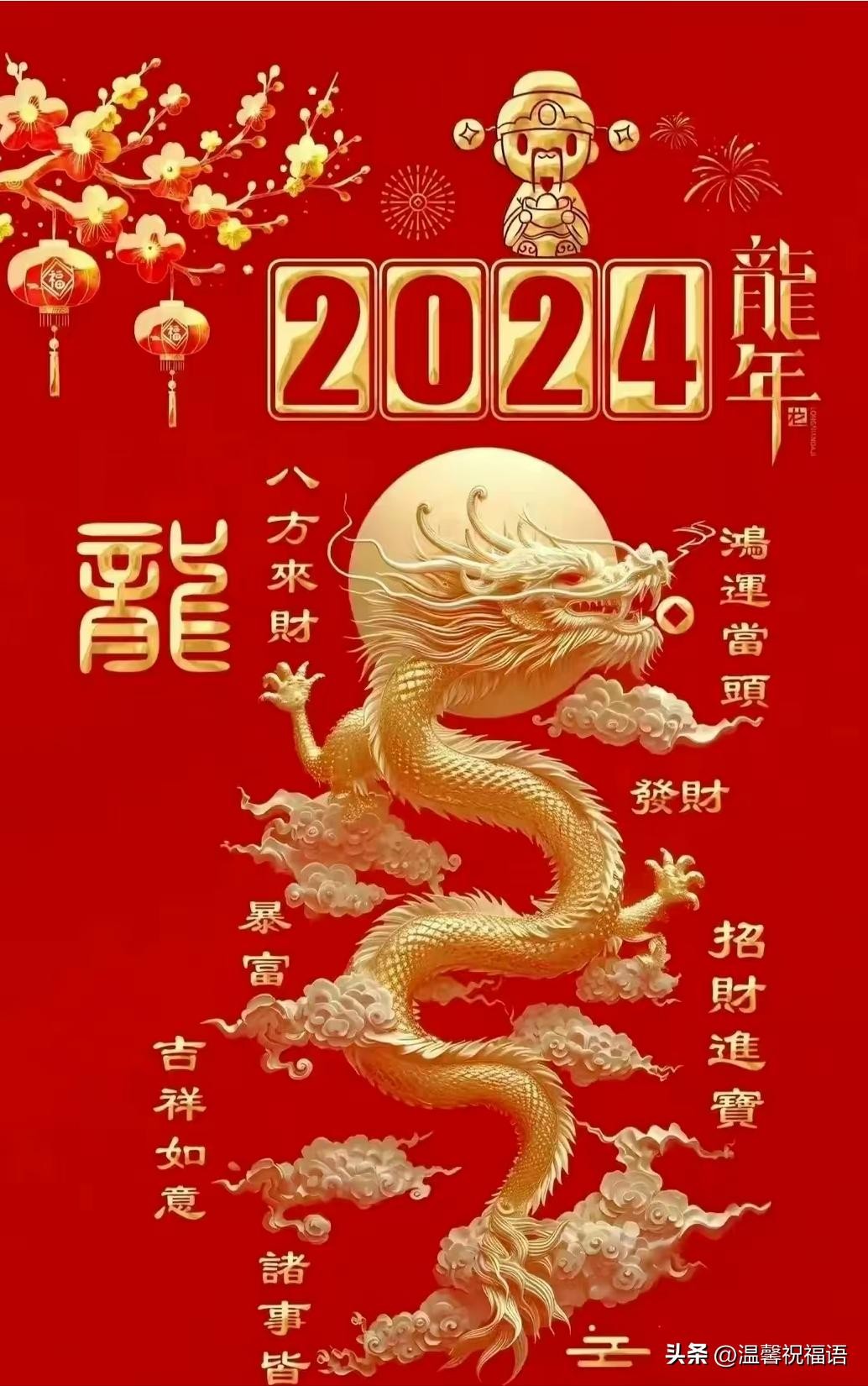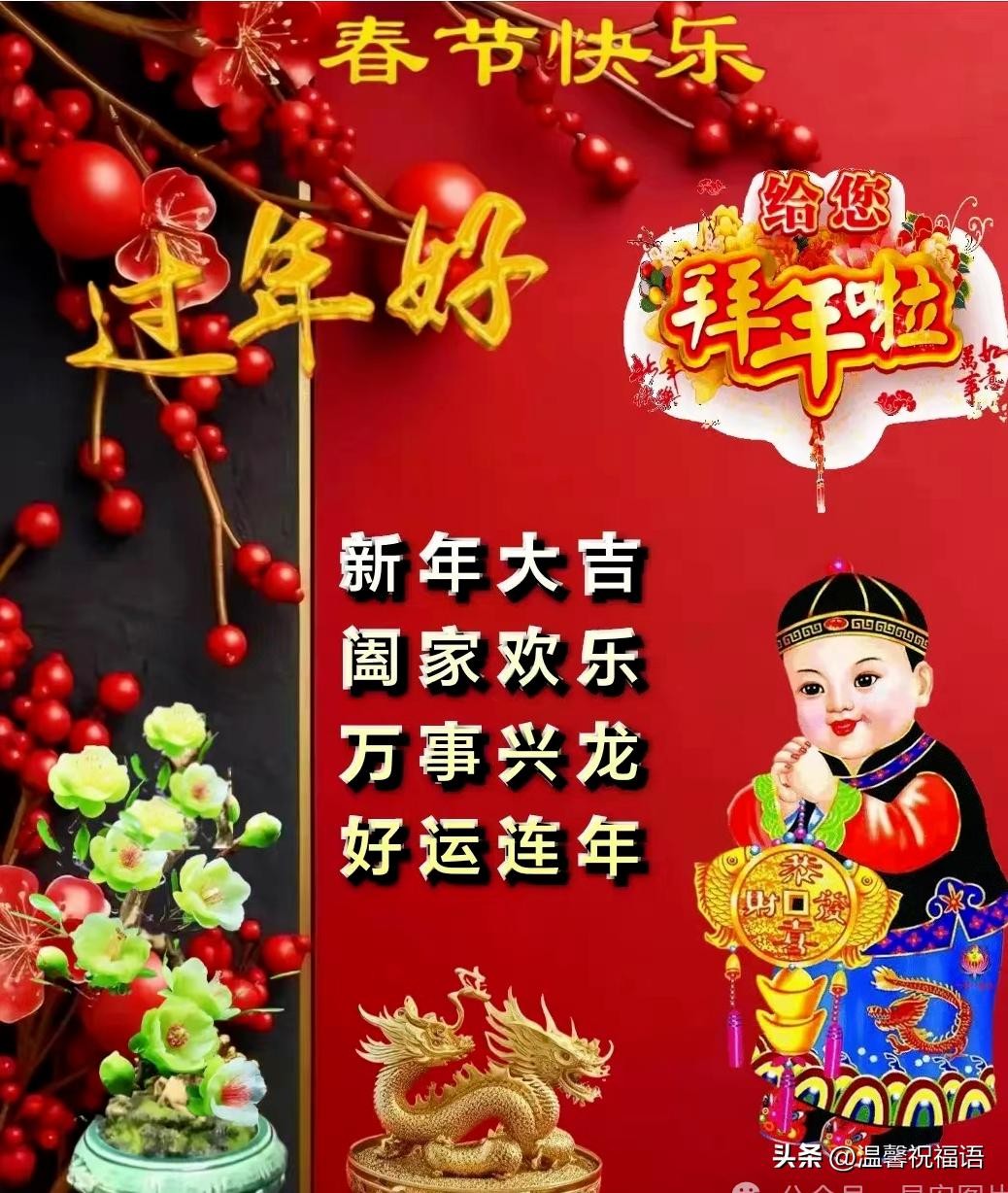 龙年祥瑞送福来,喜庆热闹笑开怀。财神拱照永发达,好运连连常相随。家庭团聚温馨乐,健康平安笑嘻嘻。龙年新春喜洋洋,幸福快乐共欢腾。
