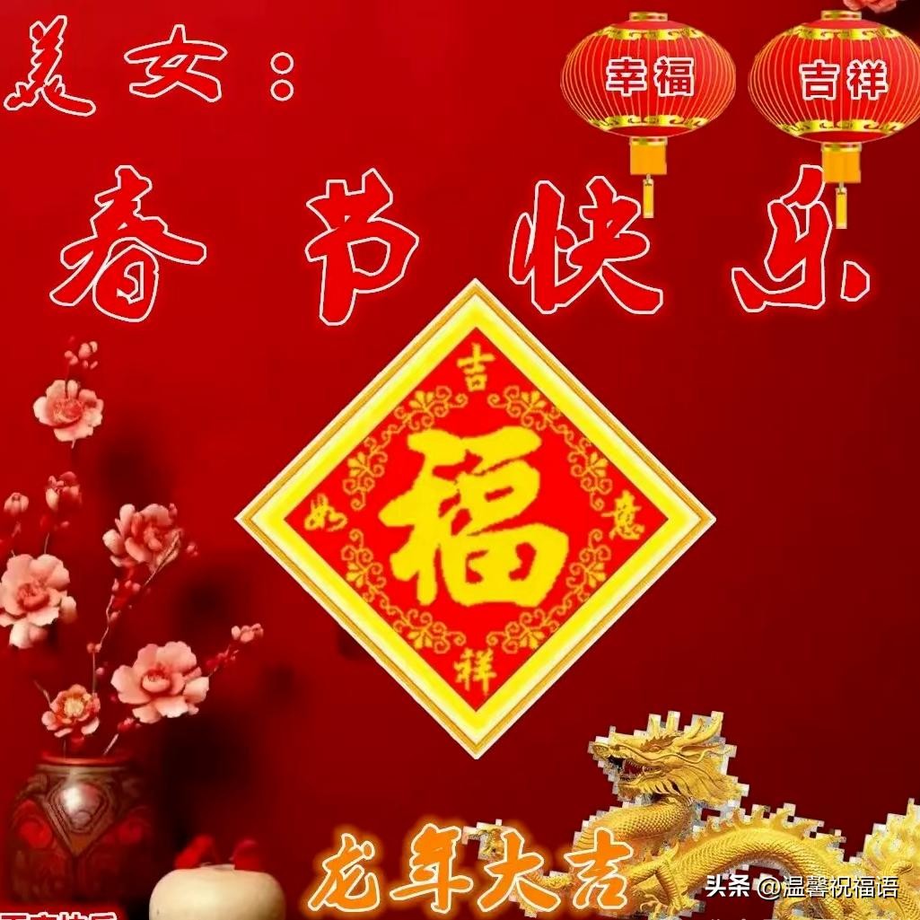 龙年春节祝愿你:喜气洋洋,满面阳光灿烂;兴高采烈,心情舒畅灿烂;大步流星,金光大道闪耀;千家万户,笑语盈盈灿烂;祝福提携,暖心相伴灿烂。祝你春节快乐,龙年大吉!
