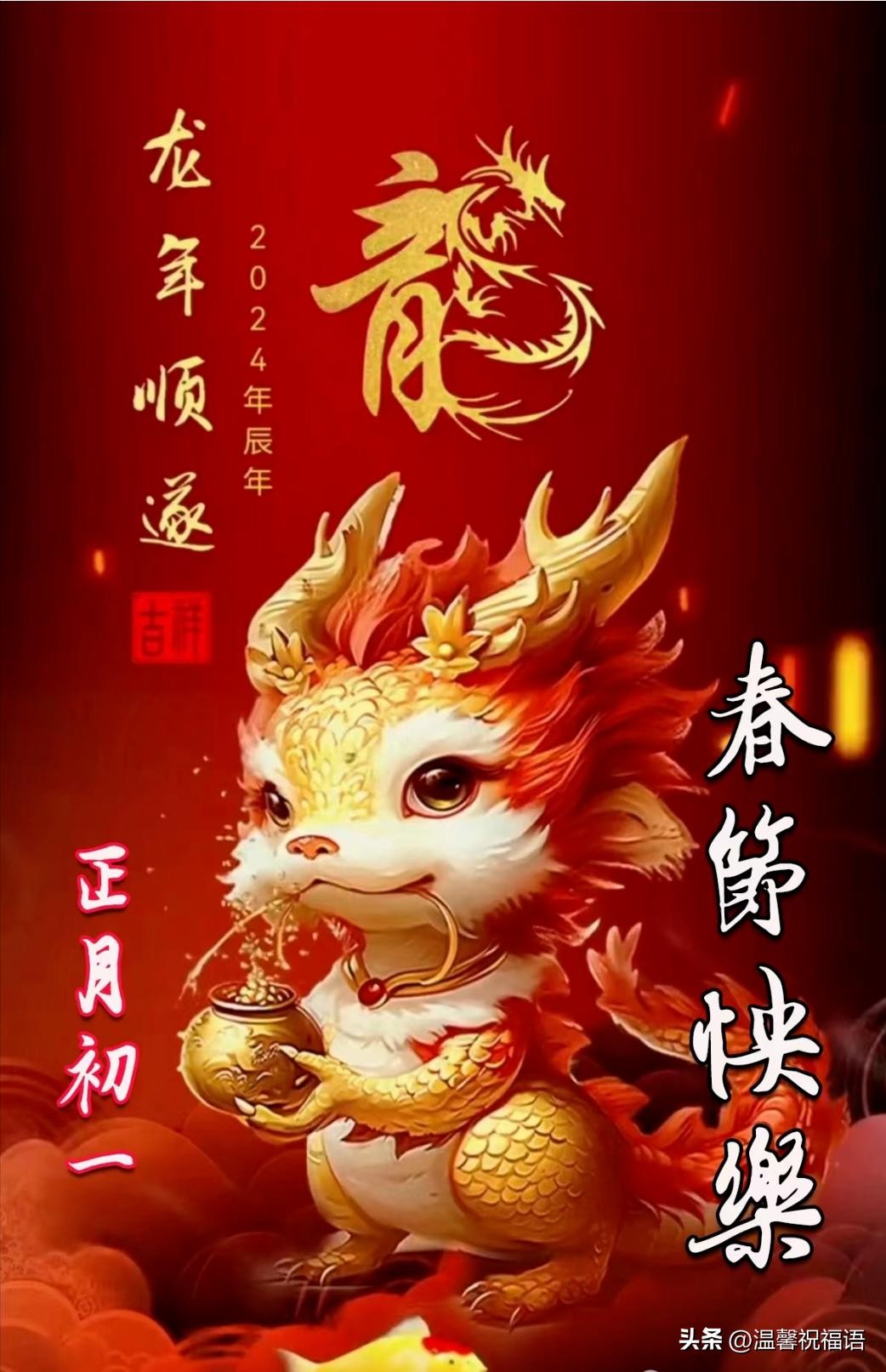 龙年到来大吉祥,大年初一福如黄。喜迎新春笑声长,家庭团圆共享康。财富滚滚财神到,健康平安绕身旁。龙年祝福送到府,新春快乐福满堂!