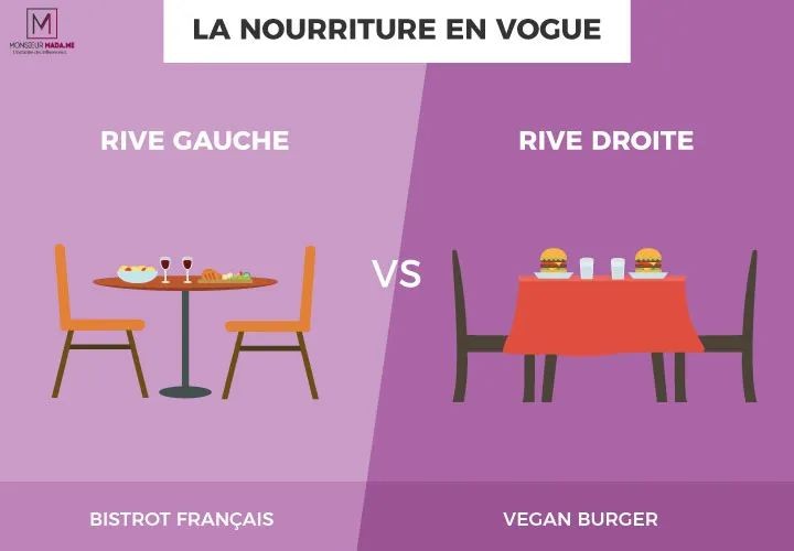 在饮食习惯上,左岸人的餐桌上以传统法餐为主,而右岸人偏爱素食汉堡等非传统美食。