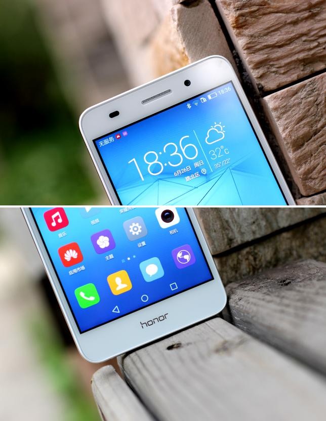 荣耀畅玩5A机身正面面板和荣耀家族的其他机型一样,非常简洁,在面板上方分别为光线/距离传感器、听筒和前置摄像头,三者在同一个水平线上。在机身面板下方是荣耀的LOGO,三枚按键内置在了屏幕里面,嵌入了EMUI系统,这也是荣耀手机的家族传承。