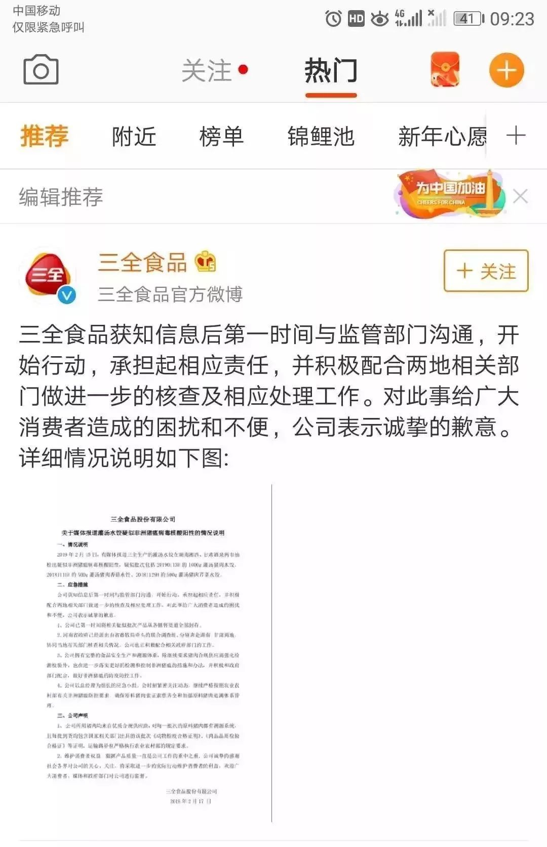 文中表示,2月15日,有媒体报道三全生产的灌汤水饺在湖南湘西、甘肃酒泉两地抽检出疑似非洲猪瘟病毒核酸阳性,疑似批次包括20190113H的1000g的灌汤猪肉水饺、20181111H的500g灌汤猪肉香茹水饺、20181129H的500g灌汤猪肉芹菜水饺。公司在获知信息后第一时间与监管部门沟通,“已第一时间将相关疑似批次产品从各销售渠道全部封存”。