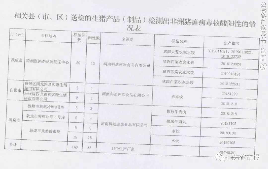 2月15日,另一网友在网上发图爆料,图片标题为“相关县(市、区)送检的生猪产品(制品)检测出非洲猪瘟病毒核酸阳性的情况表”。根据图片信息,共计11个生产厂家、40批次产品的83个样品检出阳性,此次参与抽检的样品总份数为149份,采样地点来自兰州市、金昌市、酒泉市、白银市、武威市等5个城市。一批次生产批号为20181129的三全灌汤水饺(猪肉芹菜),一批次生产批号为20181111的三全灌汤水饺(猪肉香菇)在列。