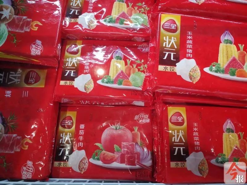 在潭中西路联华和沃尔玛超市,以及跃进路南城百货超市,记者看到冰鲜区冰柜里,均摆有三全的系列产品,有汤圆、馄饨等,虽然也有猪肉香菇水饺,但规格都是1000g的,并未发现网友爆出的同批次水饺。