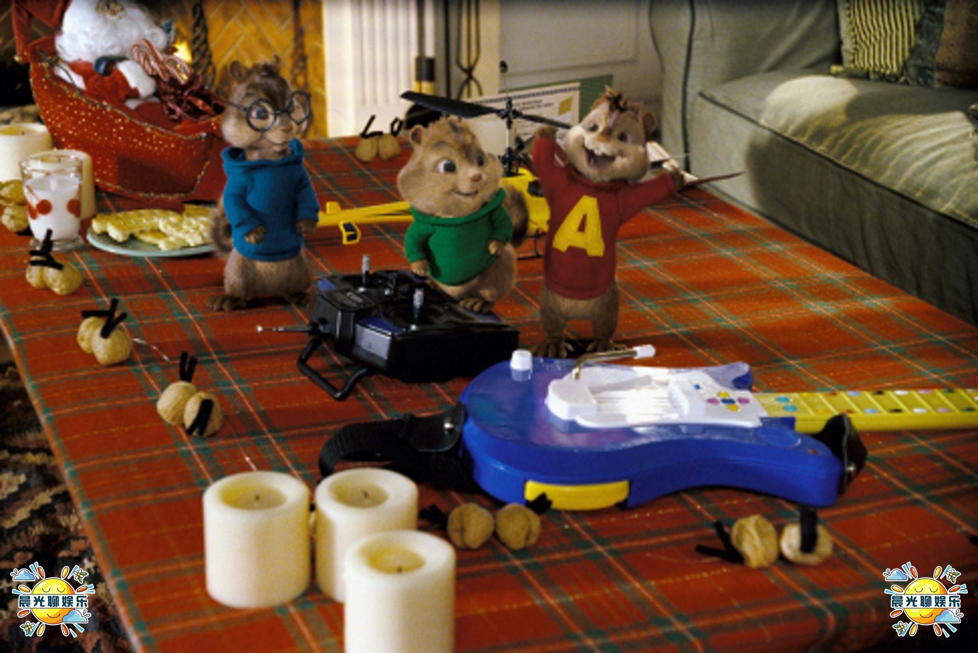 电影中花栗鼠乐团演唱的歌曲,是由人声所唱,经调快速度制造出类似鼠类吱吱叫的感觉,最早是一位美国歌手突发奇想的创意实验,他录制出歌曲后,编造出虚拟的3只花栗鼠,竟然大受市场欢迎,也就此成为美国娱乐界的经典之一。