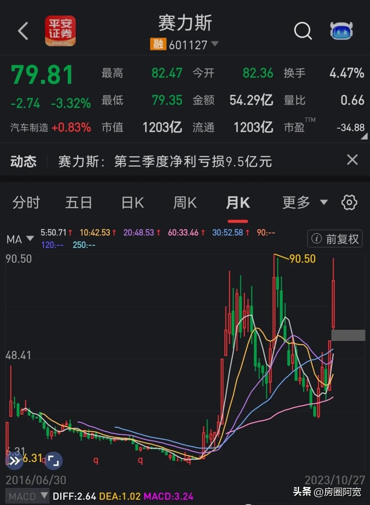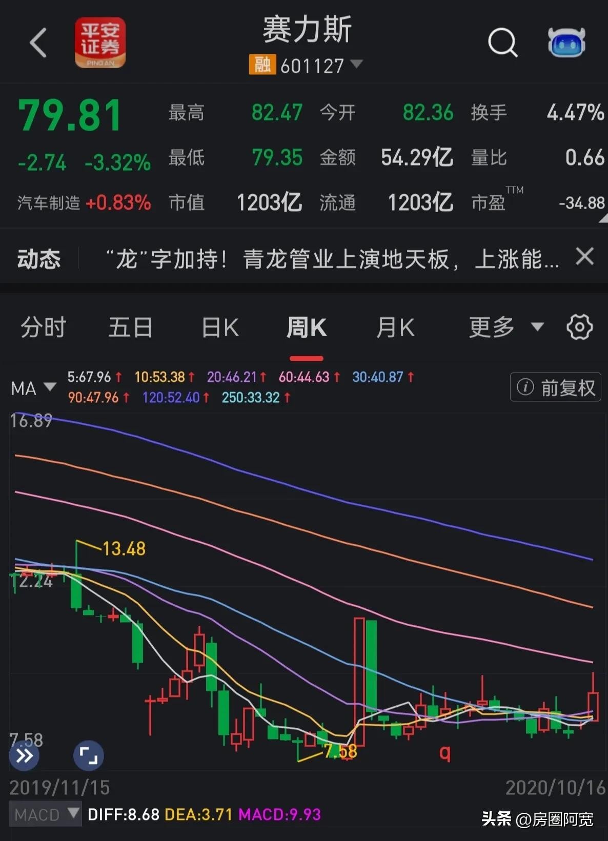 如今,赛力斯已经不是一家小公司了,其股价在这三年间已上涨了10倍,由2020年最低时的7.58元到本周五收市的79.81元,市值也已经突破了1200亿,且已成为A股中最具潜力的网红明星级企业,时下炙手可热,风头正劲。