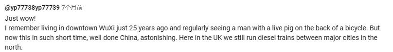 我记得25年前住在无锡市中心时,经常看到一个人骑着自行车,后面还拉着一头生猪。现在离那时也不是很远,中国干得漂亮,真意想不到。在英国,我们北部主要城市之间还在运营着柴油列车。