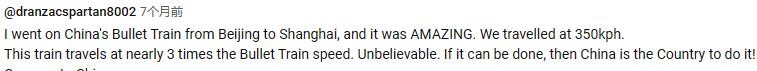 dranzacspartan8002:我坐过中国的高铁从北京到上海,非常不错,时速有 350 公里/小时。