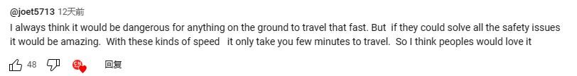 joet5713:我一直认为在地面上不论是什么东西,移动得那么快都很危险。不过如果能够解决所有的安全问题那就太好了。以这样的速度,您只需几分钟即可完成旅途,我认为未来人们会喜欢它。