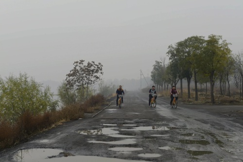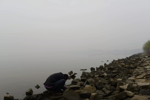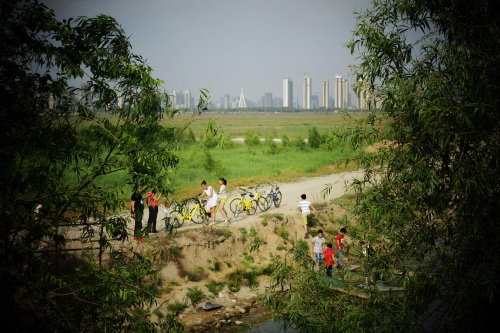 原晋阳湖西南岸有附近居民在挖泥鳅捉螺蛳,还有在坑坑洼洼的堤坝上骑车游玩。