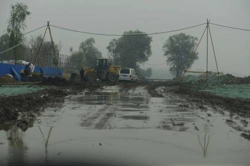 晋阳湖改造的过程中,有游客和附近居民直接沿施工道路走到湖心中间游玩