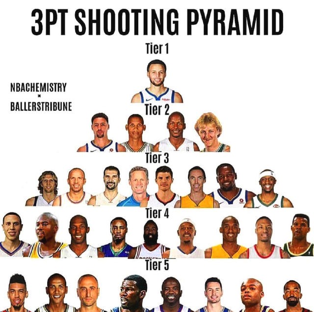 排在第二档的这四位球员在NBA的历史中都是传承一般的存在,NBA中的真正意义上的第一个三分神射,我想就是伯德了,当年在三分大赛上面,伯德的一句‘你们是来拿第二的吗’,成为垃圾话的经典。伯德之后米勒的三分在NBA声名大噪,最经典的就是米勒时候在最后9秒连拿8分逆转比赛。