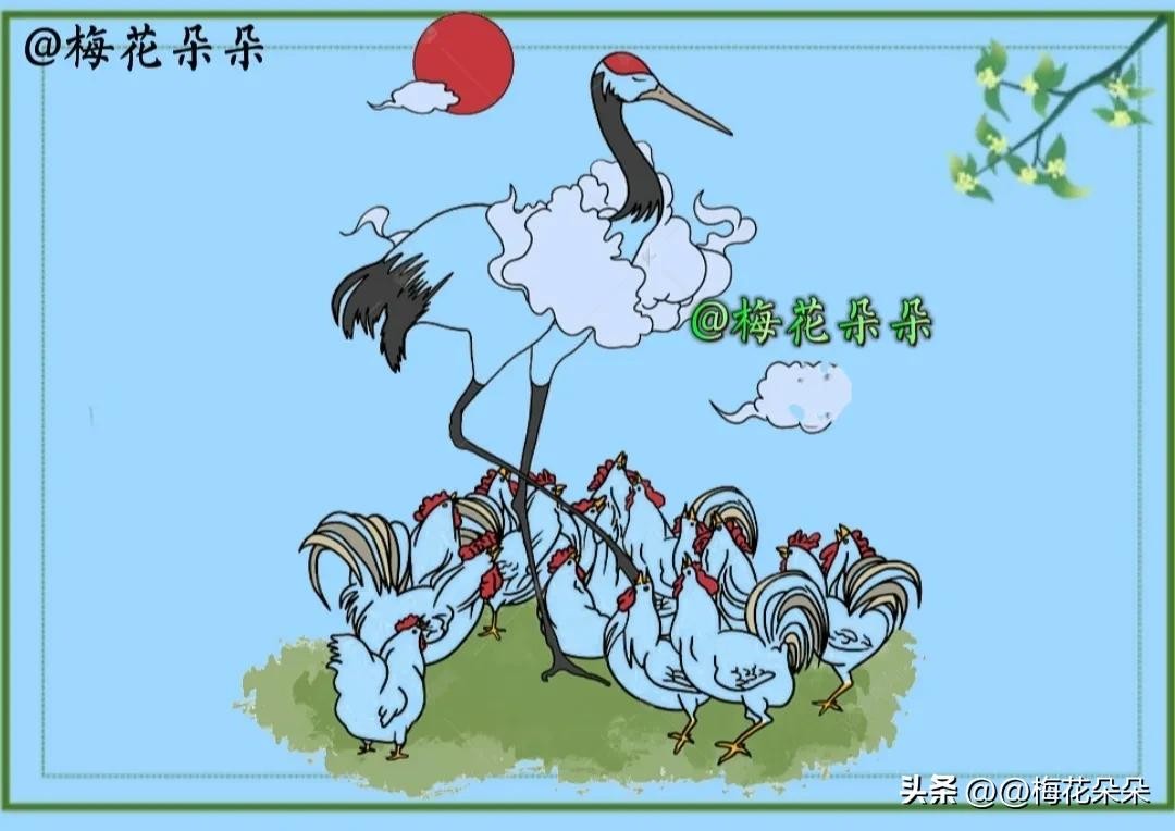 高高大大的仙鹤的脚下围着一群白色大公鸡,这些大公鸡都不及仙鹤的腿高。
