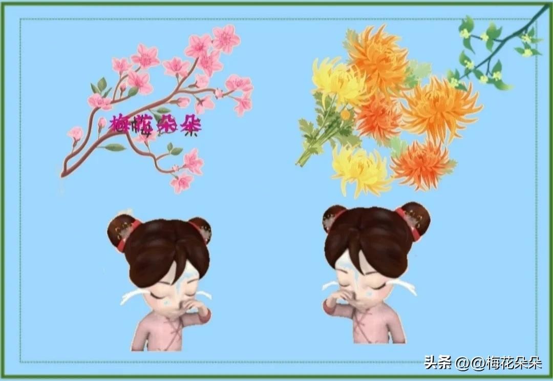 图片上面开着粉色的桃花和黄色橙色的菊花(两种花分别代表什么季节),图片下方两个女孩都在哭泣,看起来很是伤心。