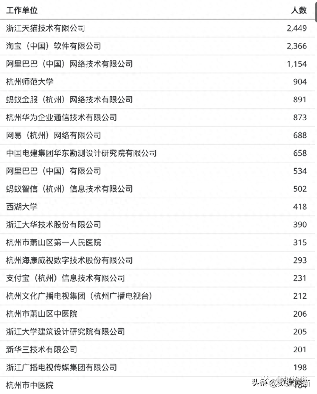 在工作单位的人才数量排序中,阿里系遥遥领先,前三名的分别是天猫、淘宝和阿里巴巴。