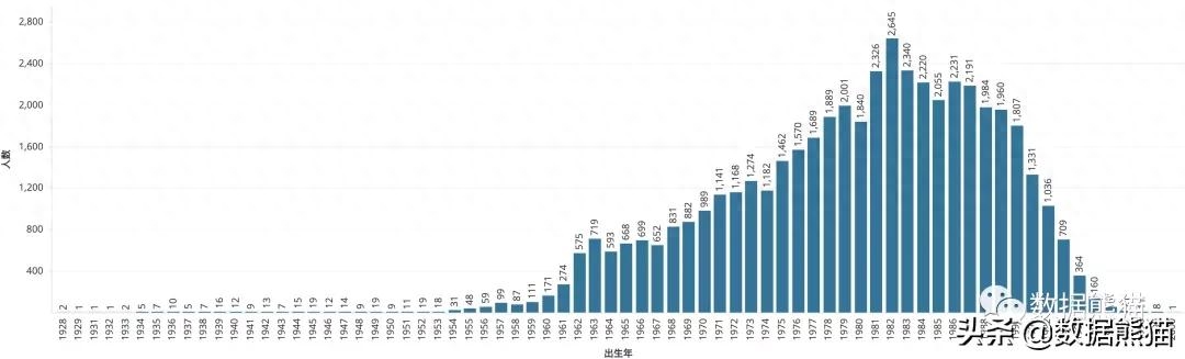 人才年龄分布中,主力人才出生年份在1970年-1990年,其中1982年的人才最多,占据了2645人,这部分出生的人也是中国教育最蓬勃的年代。