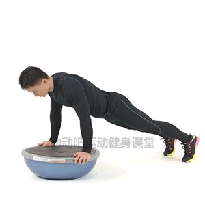 2.双臂屈肘,身体下沉,降至胸部靠近BOSU球,保持腹部收紧;