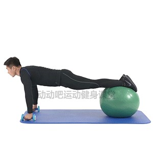 1.俯撑姿,双手支撑于地面,双脚脚尖置于瑞士球上,手臂伸直,身体从头到脚呈一条直线;