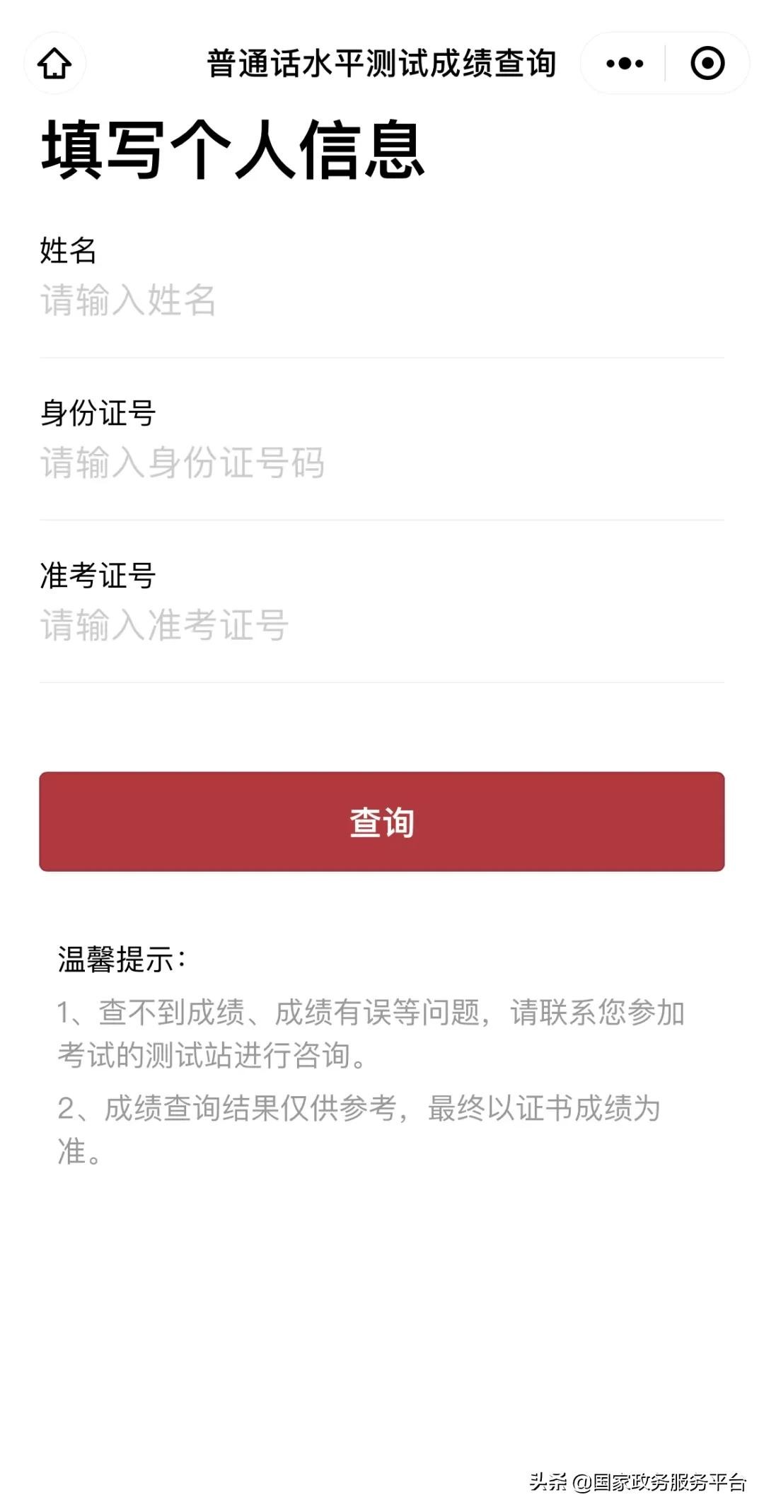 1、您可以打开国家政务服务平台PC端、移动端APP或打开微信、支付宝、百度APP等端口,搜索“国家政务服务平台”,进入“普通话水平测试成绩查询”服务。