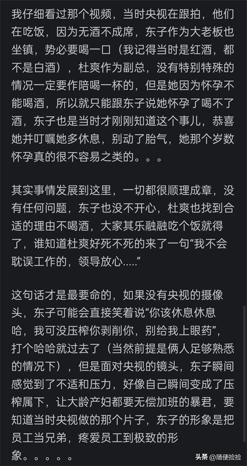 杜爽可以以怀孕为由拒绝喝酒,但是不应该提到“不会耽误工作”,间接的给东子在镜头前扣上资本无尽剥削,没有人情的帽子