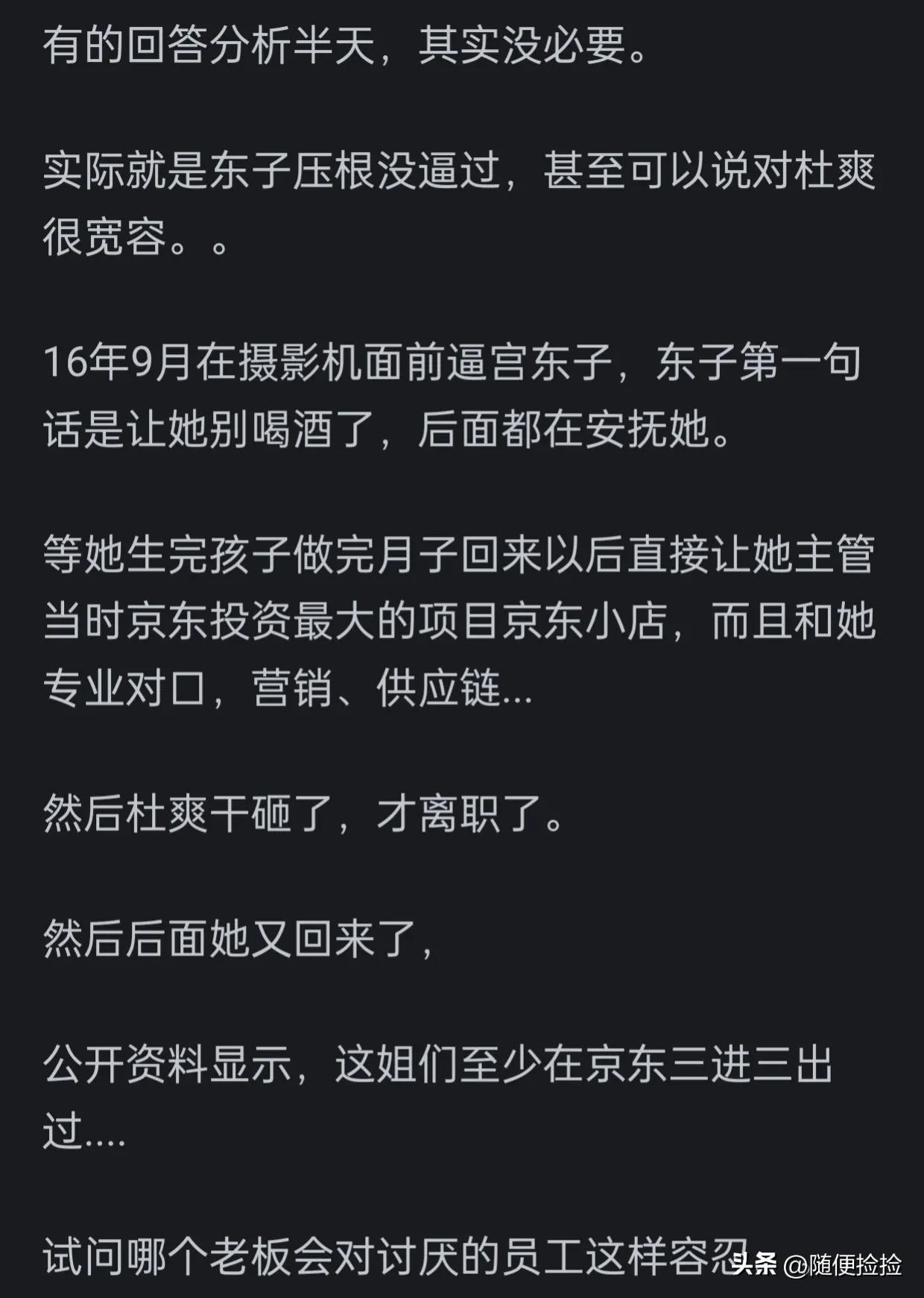 还记得17年当着央视镜头向刘强东坦白自己有孕在身不能喝酒的女高管吗?她的名字叫做杜爽,而在那次央视节目播出后,不久就从京东离职了。真的是因为在酒局上说了不应该说的话,刘强东才逼走了她吗?让我们先看一下网友们的观点。