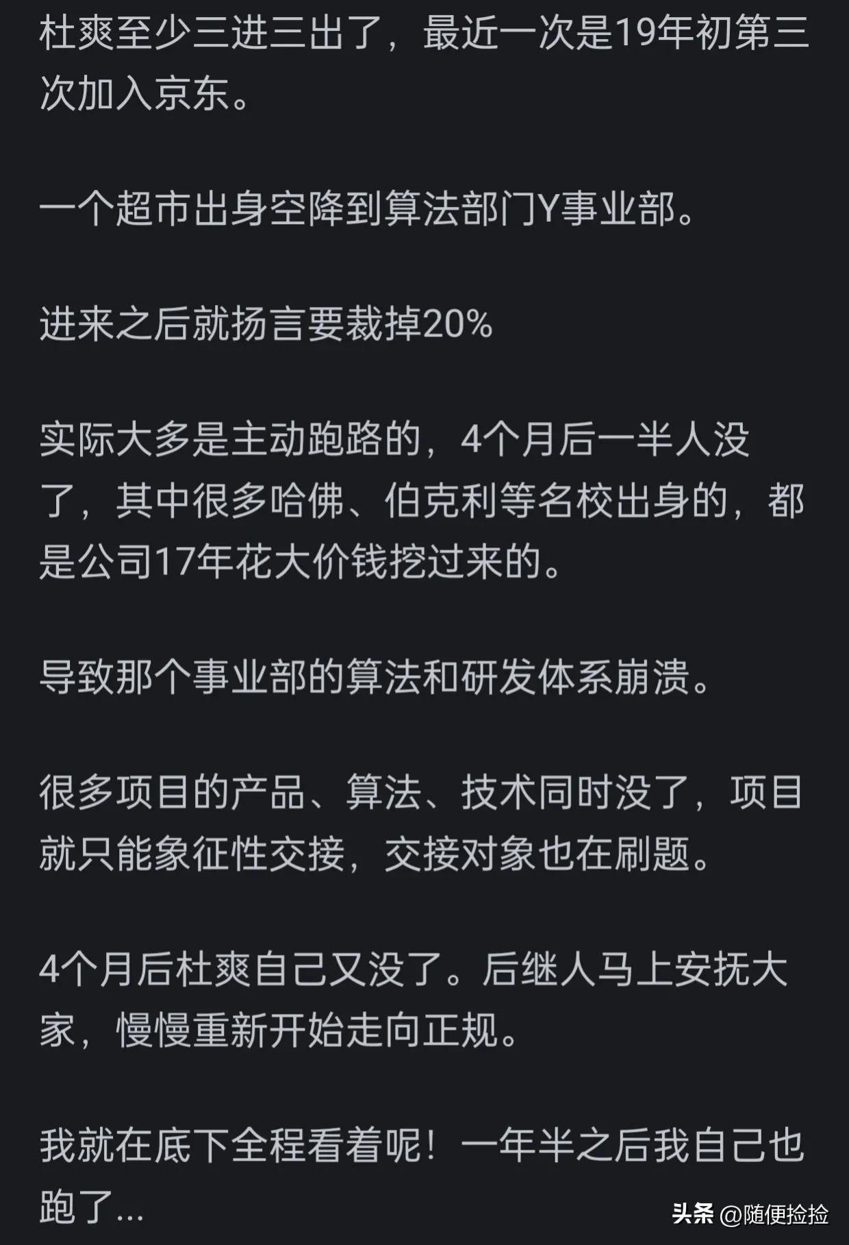 还有网友说杜爽甘愿成为公司裁员的一把刀,将公司一半多人裁员后,因为在公司名声不好主动走人