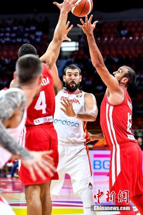 8月31日晚,在广州举行的2019年国际篮联世界杯首轮比赛C组一场比赛中,西班牙(白)以101比62战胜突尼斯队(红)。图为西班牙队球员加索尔(中)抛投。中新社记者陈骥旻 摄