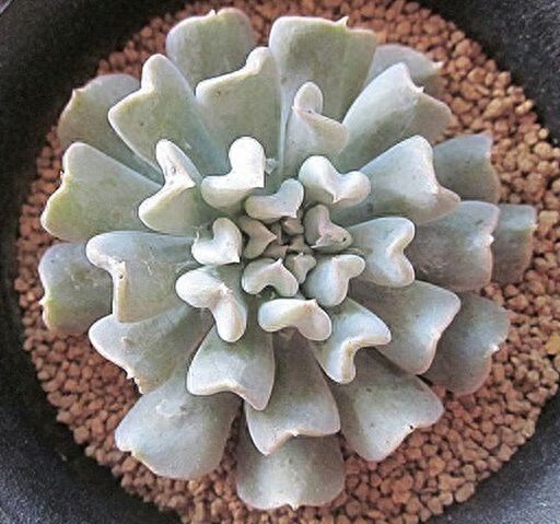 多年生常绿肉质植物,又名特叶玉蝶。叶片匙形,叶缘向下反卷,似船形,表面被有浓厚的白粉,叶缘因光照呈淡粉色。花期在春季至初夏,花小,黄色。植株直径可达20-30厘米,高度可达15-30厘米。特玉莲开花时,成株通常同时长出两根或以上的拱形总状花序,高15-20厘米。花冠呈五边形,长1.9-2.0厘米,直径1.0厘米,亮红橙色。值得一提的是,有时花朵和萼片的形状都会和叶片一样呈现出扭曲的形态。
