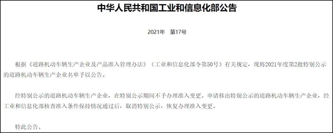 3、在特别公示期间,不受理被特别公示企业的《道路机动车辆生产企业及产品公告》新产品申报。