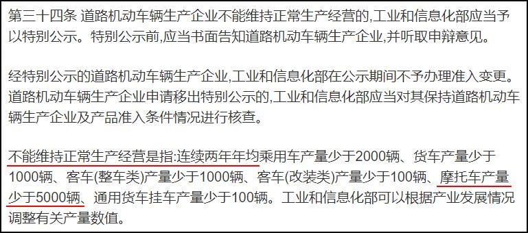 那什么是“不能维持正常生产经营”?根据《道路机动车辆生产企业及产品准入管理办法》第五章第34条规定,连续两年年均摩托车产量少于5000辆。