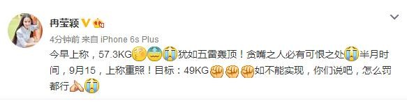 今早上称,57.3KG,犹如五雷轰顶!贪嘴之人必有可恨之处,半月时间,9月15,上称重照!目标:49KG,如不能实现,你们说吧,怎么罚都行。今早上称,57.3KG。冉莹颖微博写道