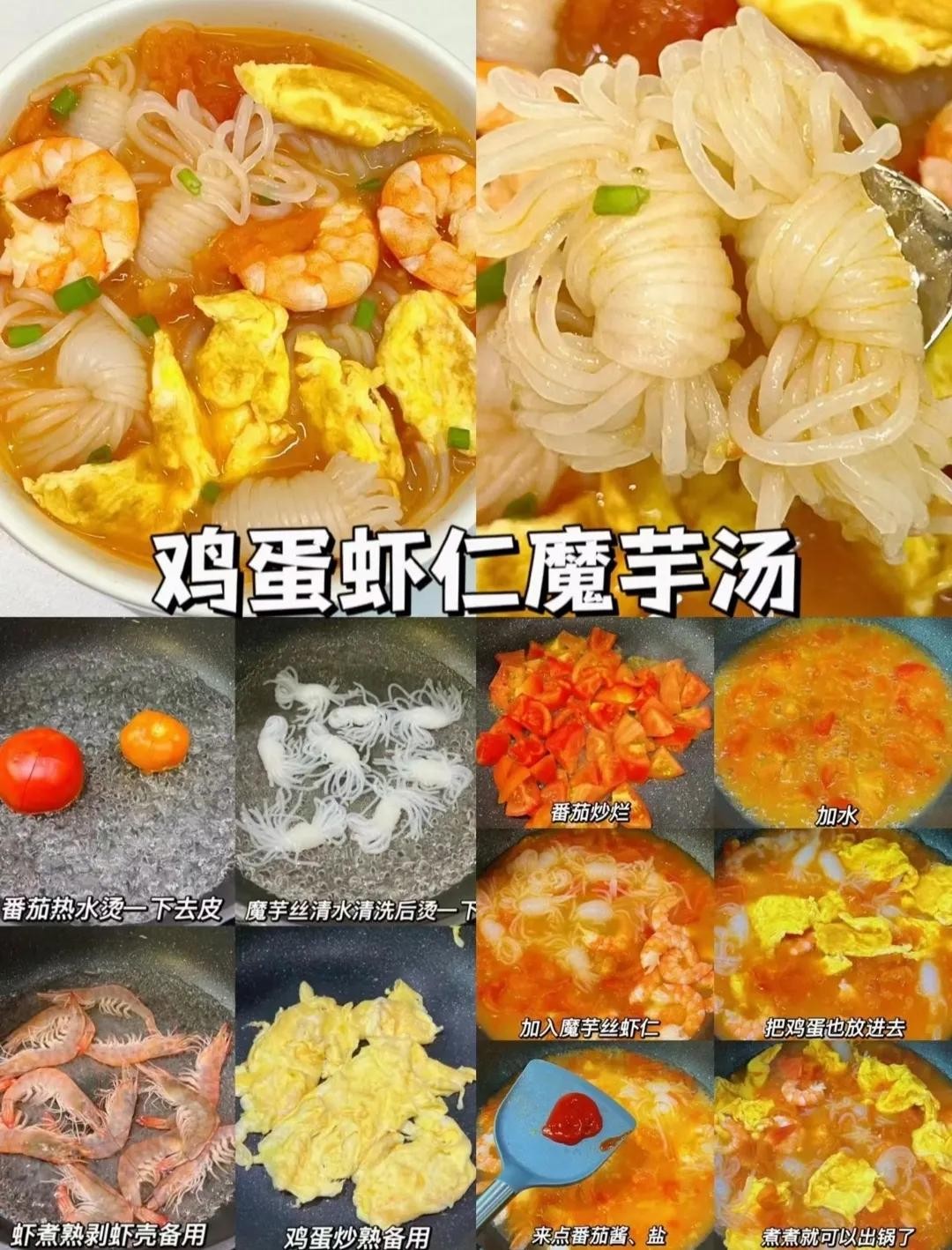 「鸡蛋虾仁魔芋汤」