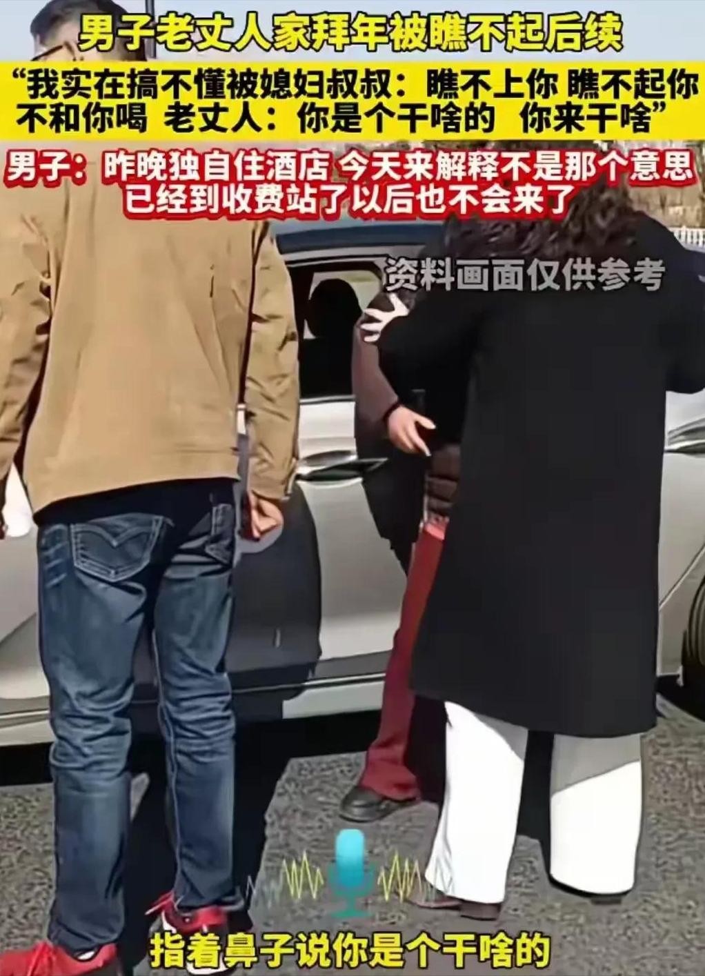 于是话赶话之下,男子就对着那位叔叔问了句“为什么看不起自己”,可没想到这一句话直接将媳妇一家人惹毛了,在老丈人的带领下,更是将男子赶到了车边,并且用手指着鼻子质问他说:“你是来干啥的?你要干啥?”