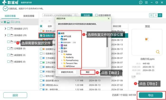 步骤2:在指定位置上选择好需要恢复的文件后,选择【导出】;在弹窗中选择恢复文件的存放位置,点击【确定】。