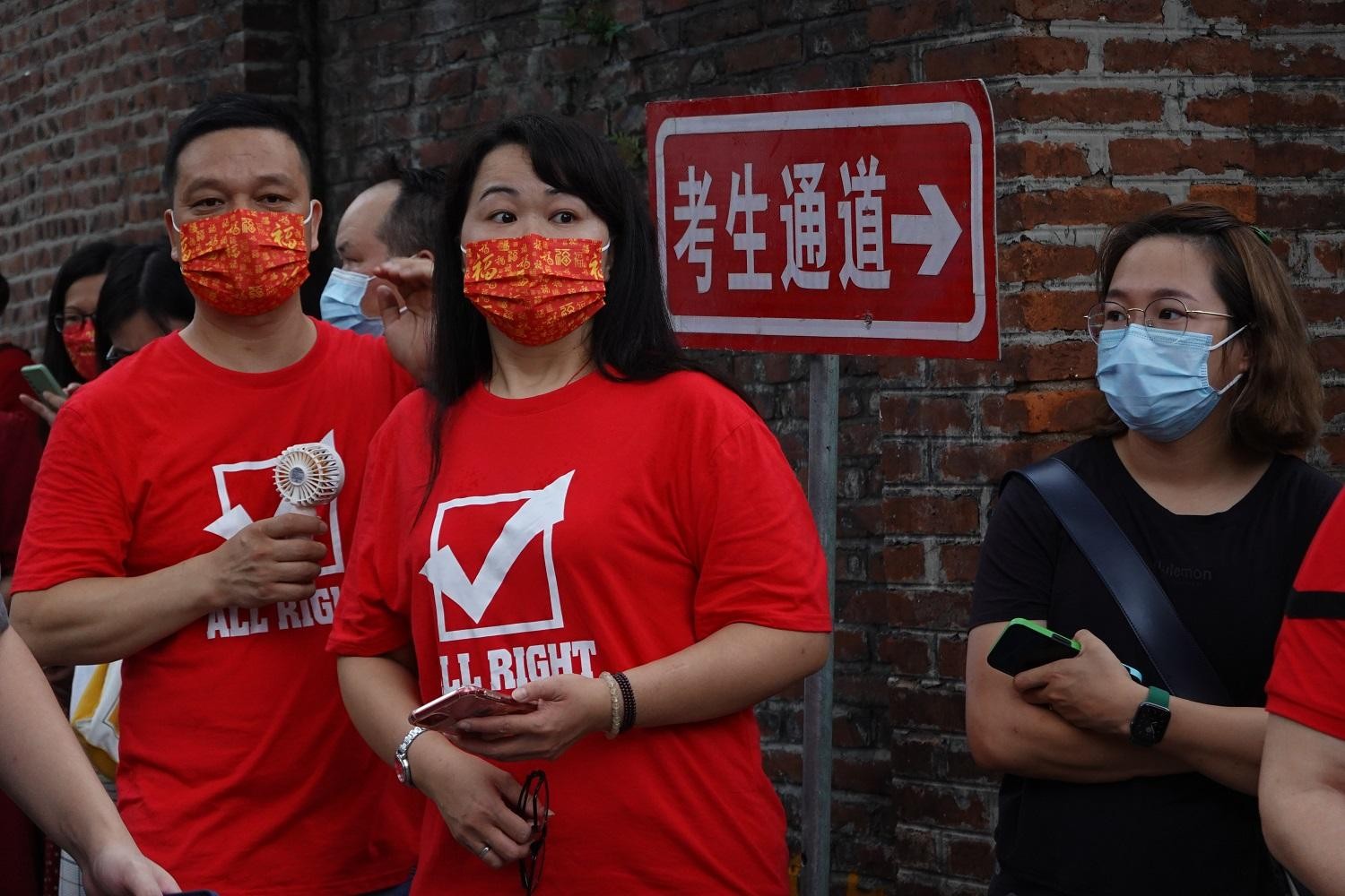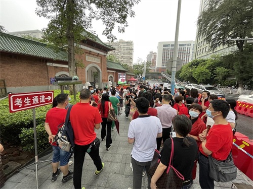 广州市南武中学考场门口,家长和老师组成的送考队伍为考生助威加油