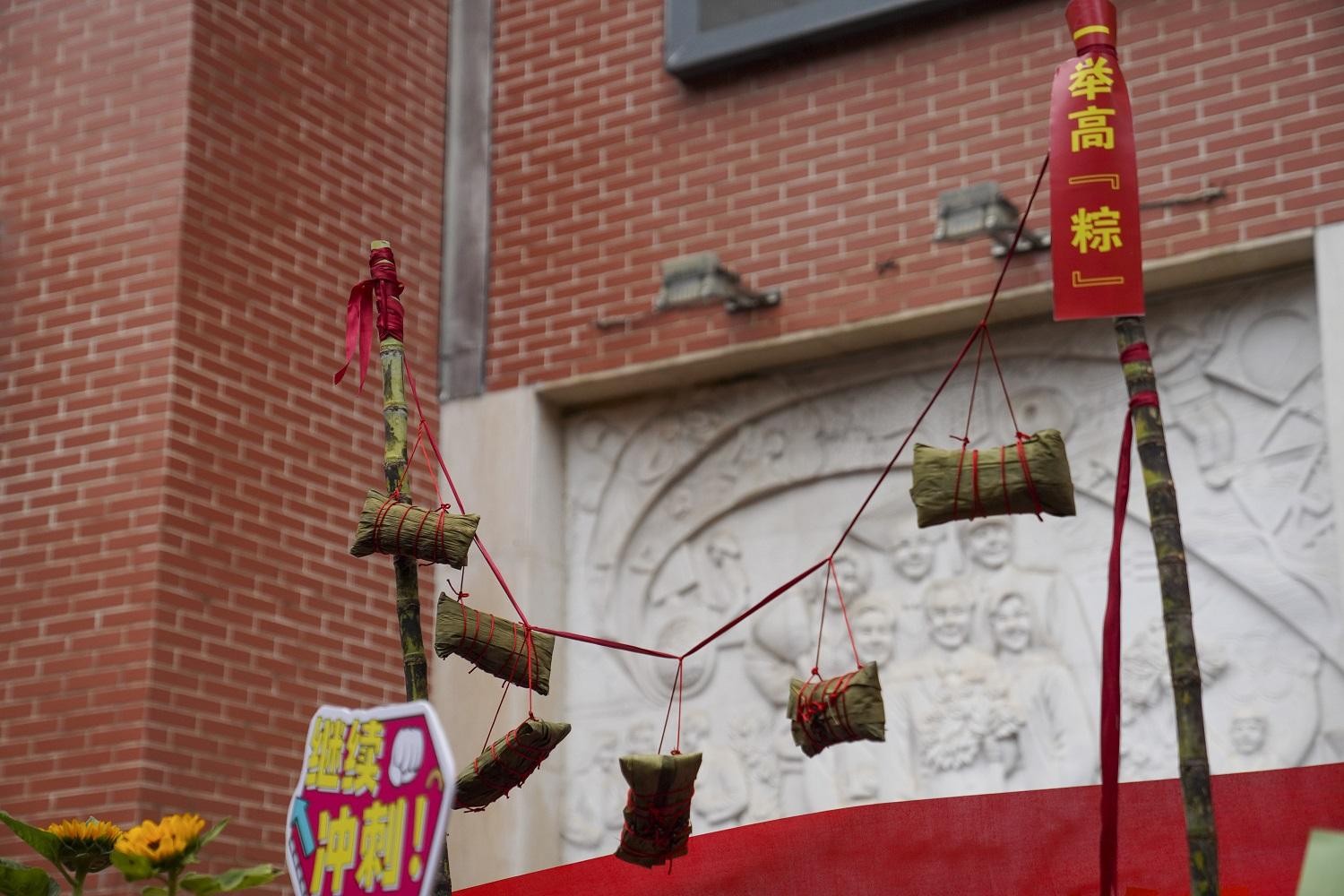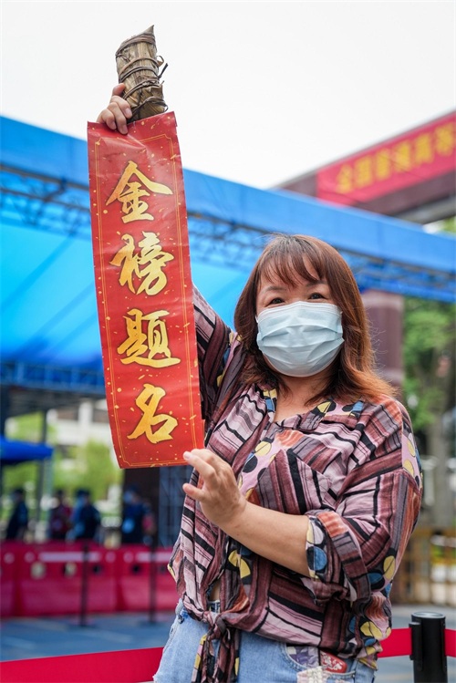 一位家长高举粽子和“金榜题名”手幅祝福考生