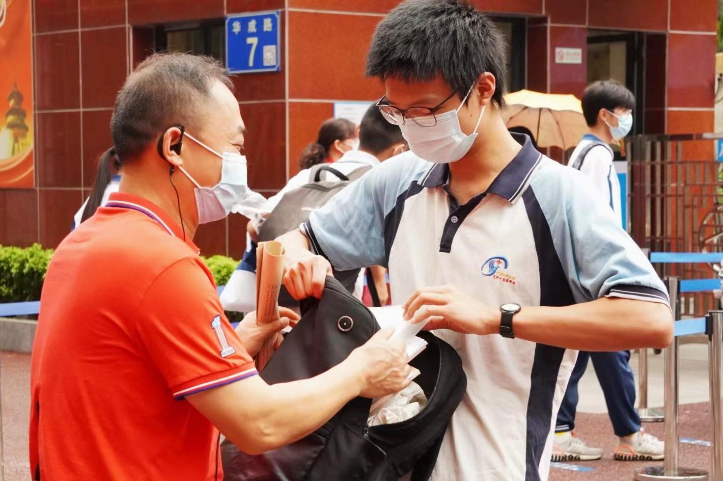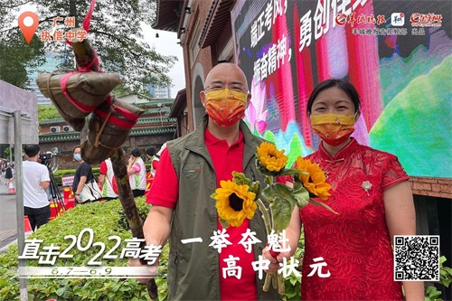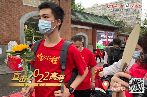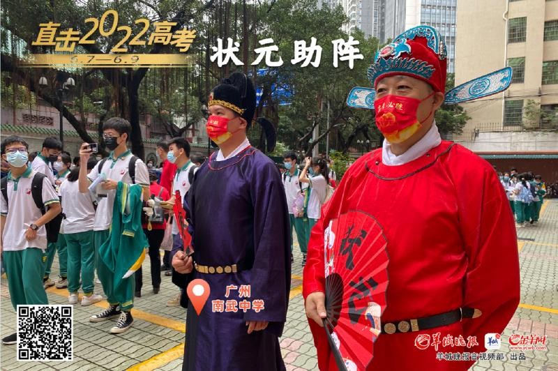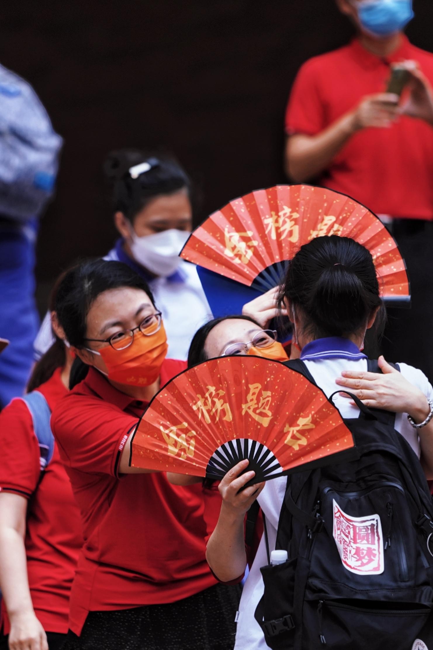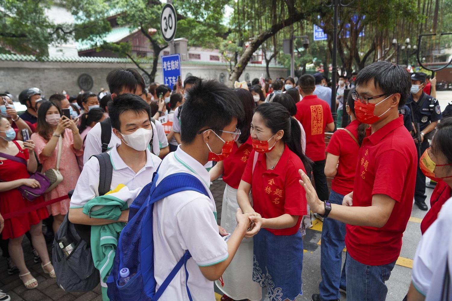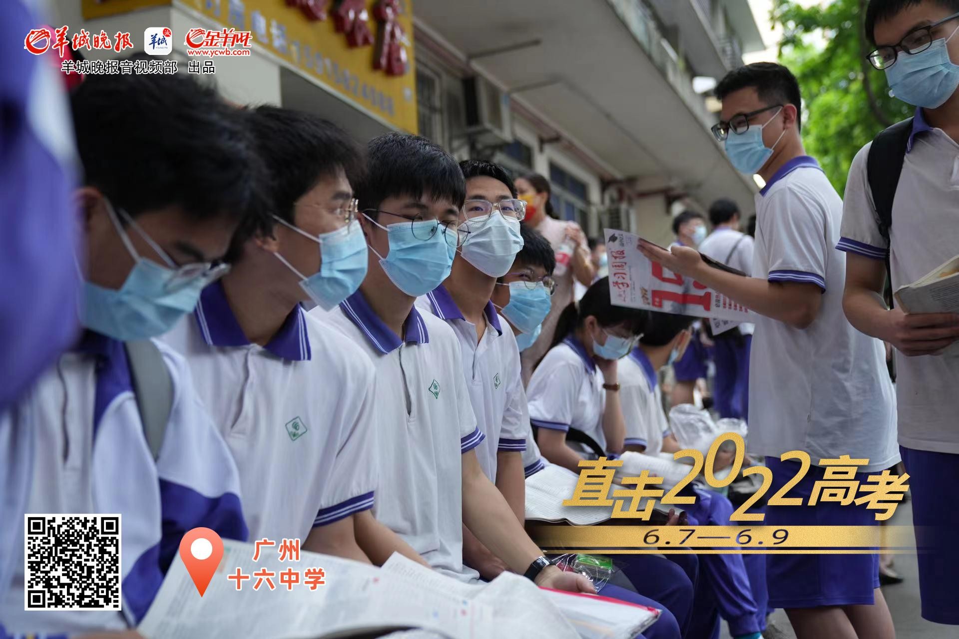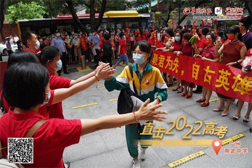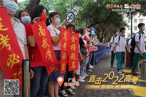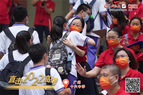 广州市各个考点门口前迎来了考生和送考的家长和老师,家长和老师与考生击掌、相拥,为孩子们加油鼓劲。“一举夺魁”“状元助阵”,现场各种“花样”助威,祝愿考生旗开得胜。