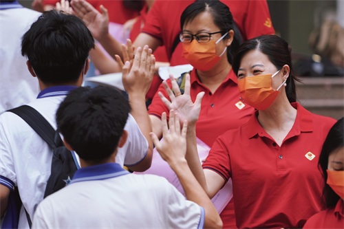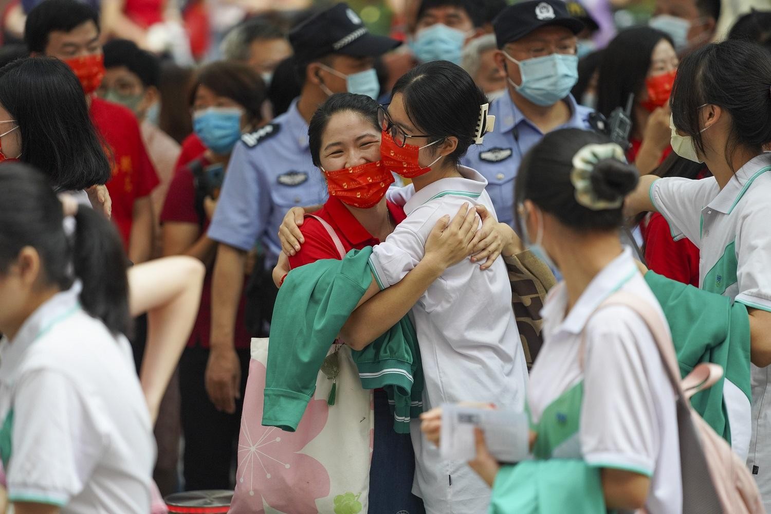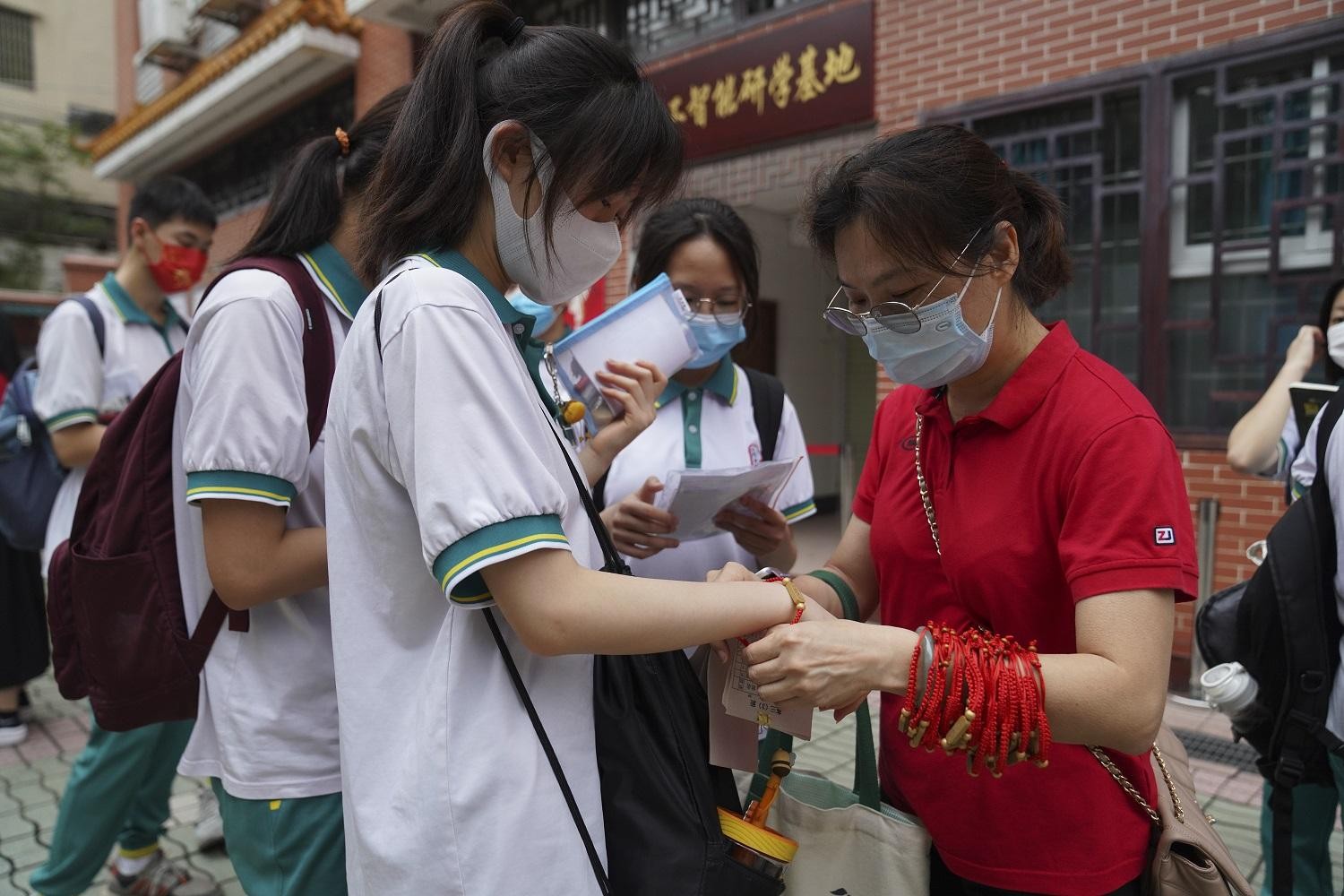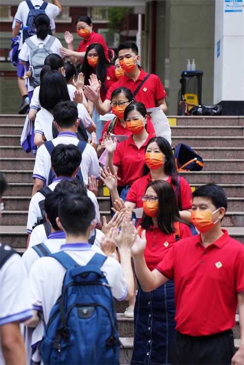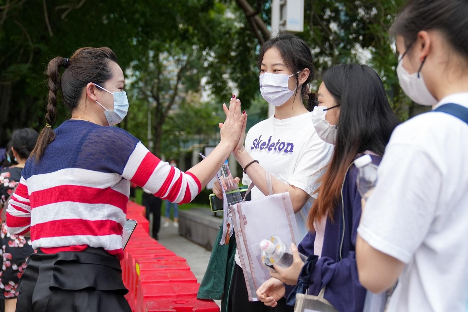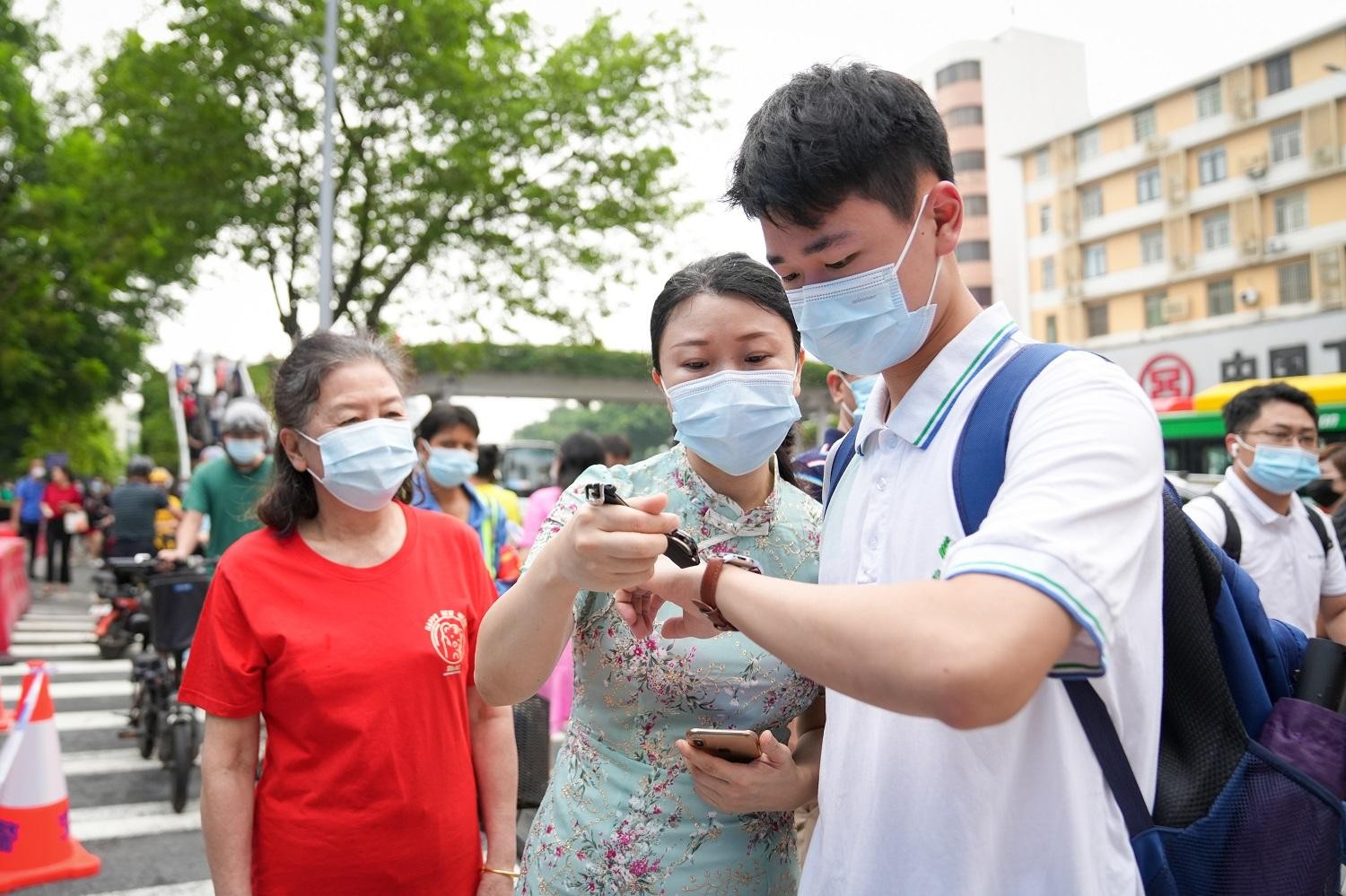 广州市各个考点门口前迎来了考生和送考的家长和老师,家长和老师与考生击掌、相拥,为孩子们加油鼓劲。“一举夺魁”“状元助阵”,现场各种“花样”助威,祝愿考生旗开得胜。