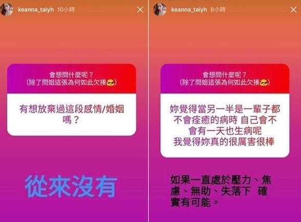 这6、7年来,谢和弦的病况时好时坏,2017年一度发出剪国旗的照片,事后坦言又是情绪问题:“每年7、8月会开始很躁,老婆、经纪人及朋友都有提醒我,要调整一下。”Keanna则会在身边扮演提醒角色,严厉告诉他“你伤到别人,不好笑”,适时把谢和弦从失控边缘拉回来。