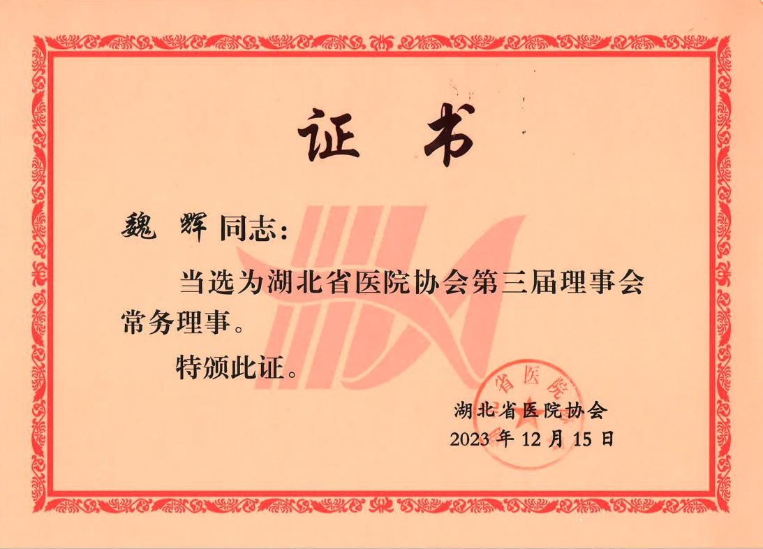 在12月15日召开的湖北省医院协会第三届理事会第六次会议上,天门市第一人民医院党委副书记、院长魏辉当选为湖北省医院协会第三届理事会常务理事。