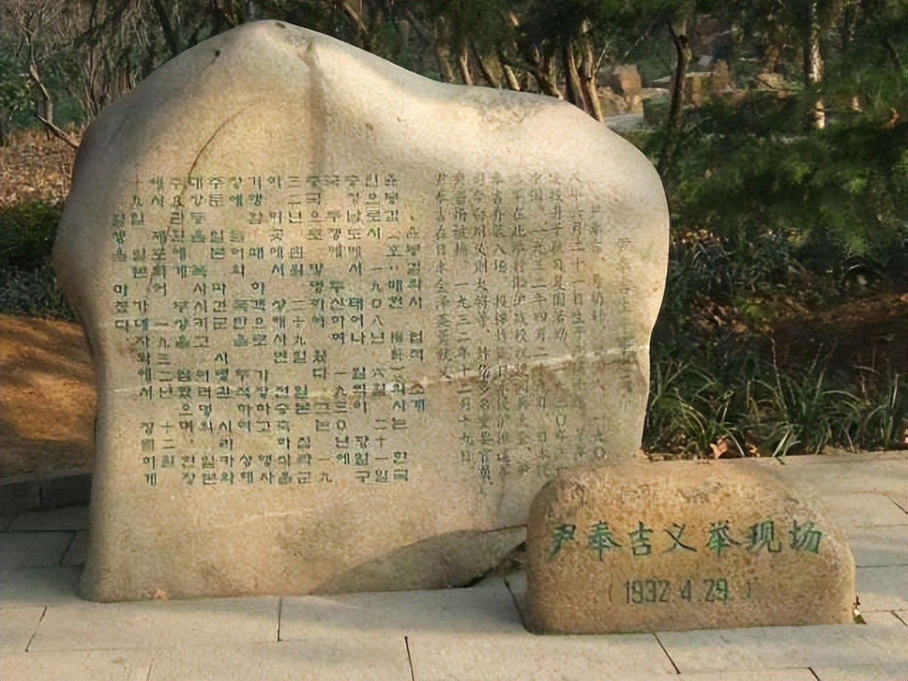 在鲁迅公园尹奉吉义举纪念地建梅亭,树有碑石。